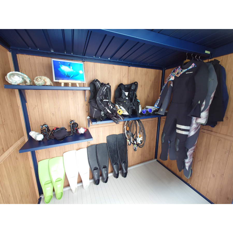 ダイバーの方でしょうか。ウエットスーツ、ベスト、フィン、ゴーグル、シュノーケル、レギュレータなどの機材が大切に保存されており、ダイビング愛を感じました。
