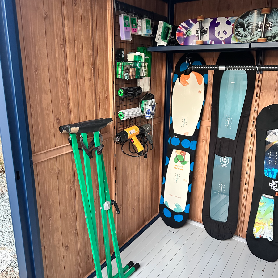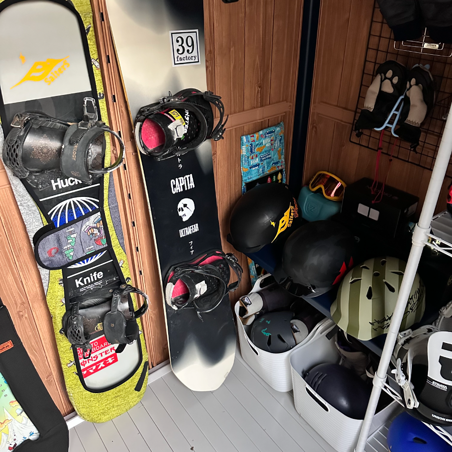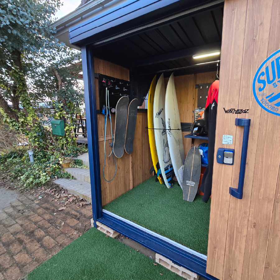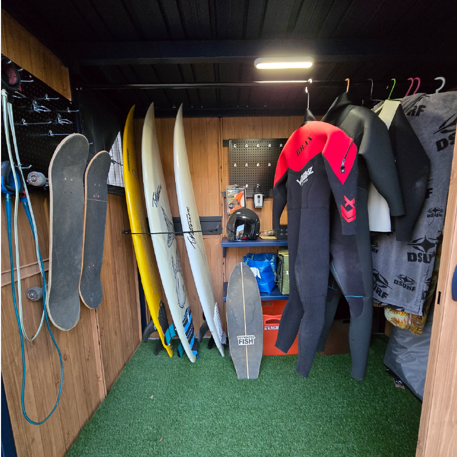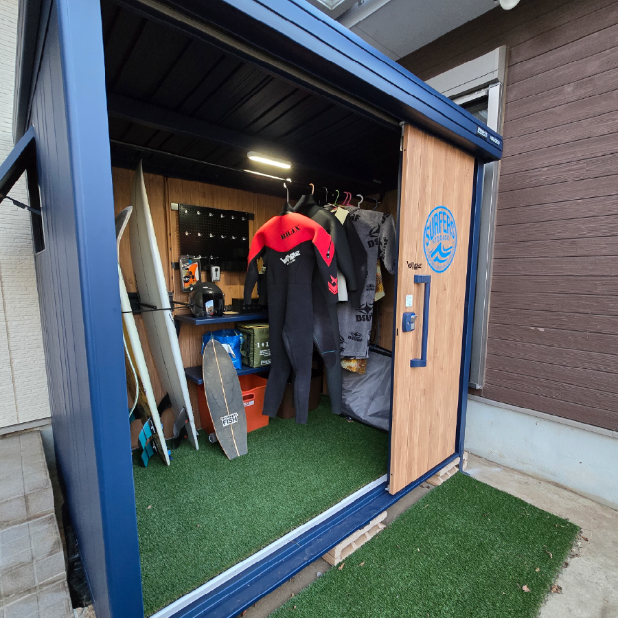 ブラックの有孔ボードを巧みに活用し、リーシュやフィン、スケートボードまで美しく機能的に収納された内装に深いサーフィン愛を感じました!棚幅の設計や人工芝の作りも秀逸で、準備の時間さえ特別にする空間に仕上がっていると思います。細部まで行き届いた工夫素晴らしいです!