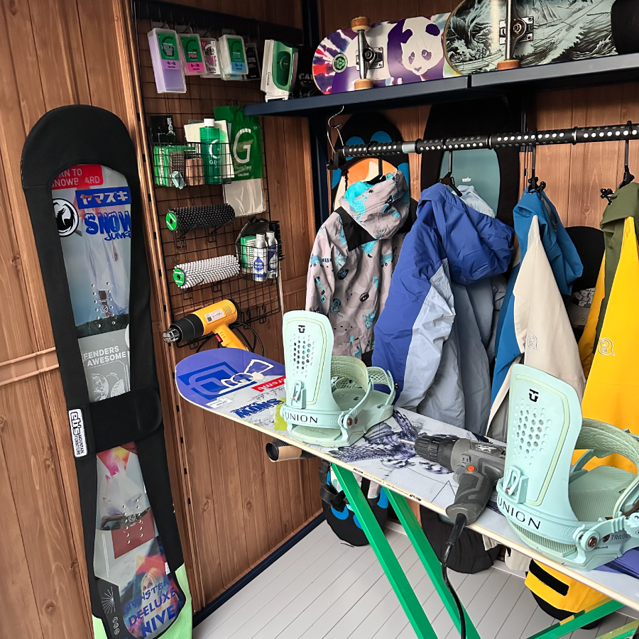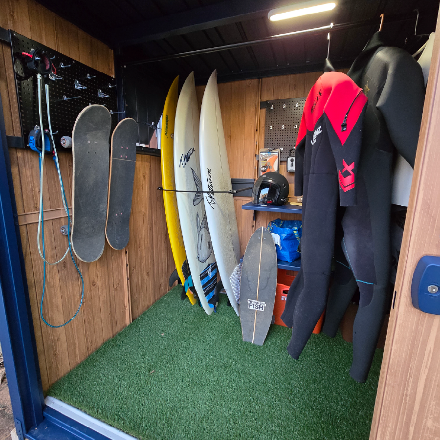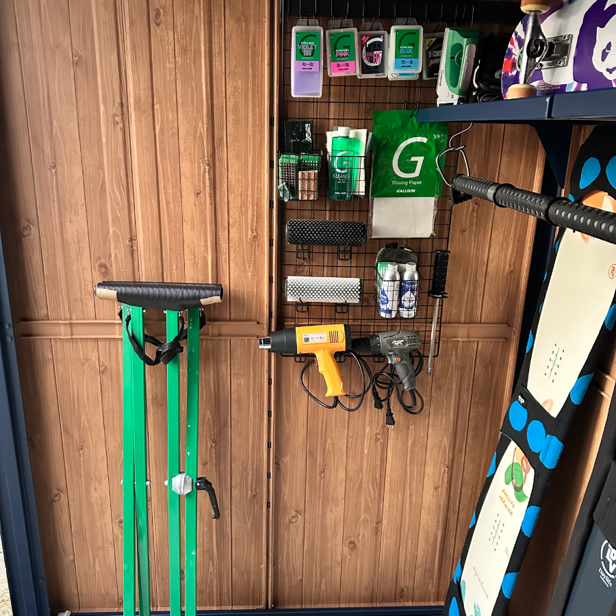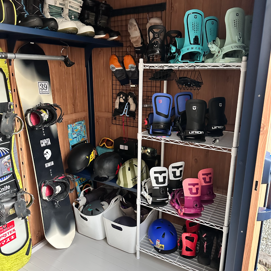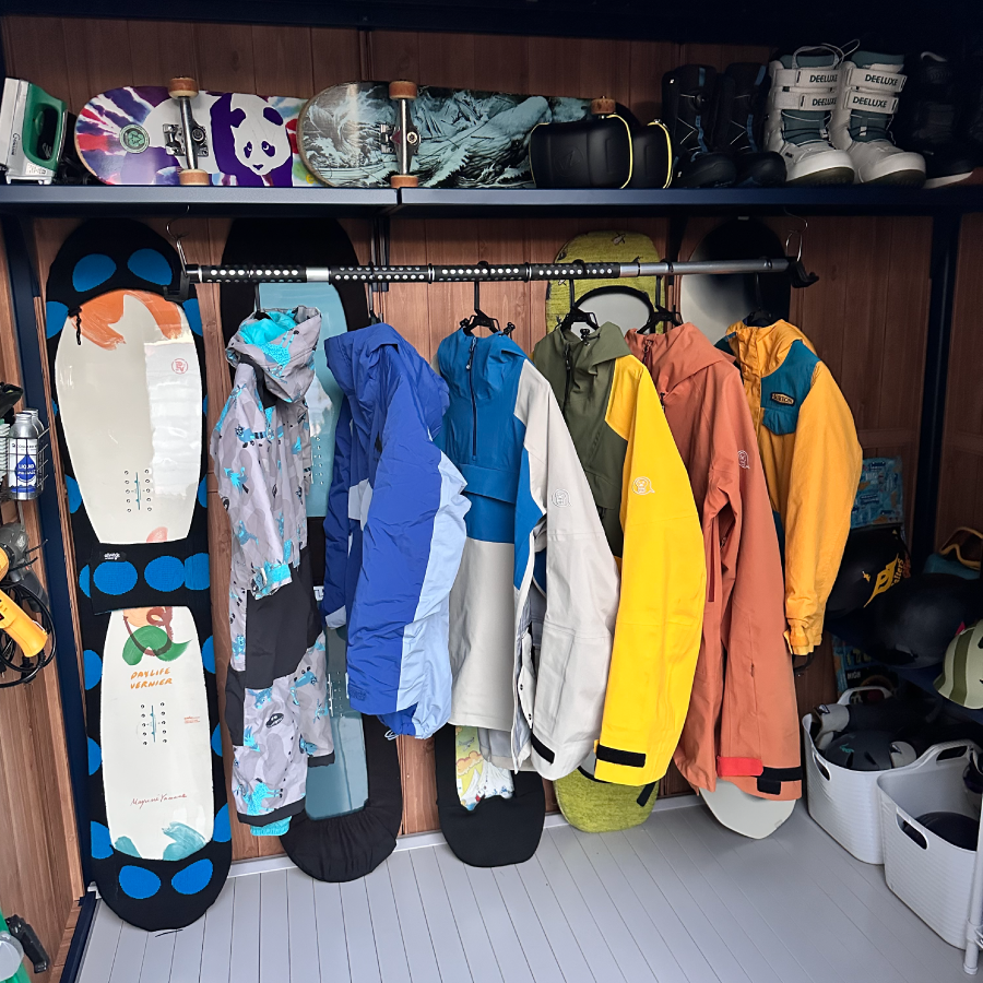 ブラックの有孔ボードを巧みに活用し、リーシュやフィン、スケートボードまで美しく機能的に収納された内装に深いサーフィン愛を感じました!棚幅の設計や人工芝の作りも秀逸で、準備の時間さえ特別にする空間に仕上がっていると思います。細部まで行き届いた工夫素晴らしいです!
